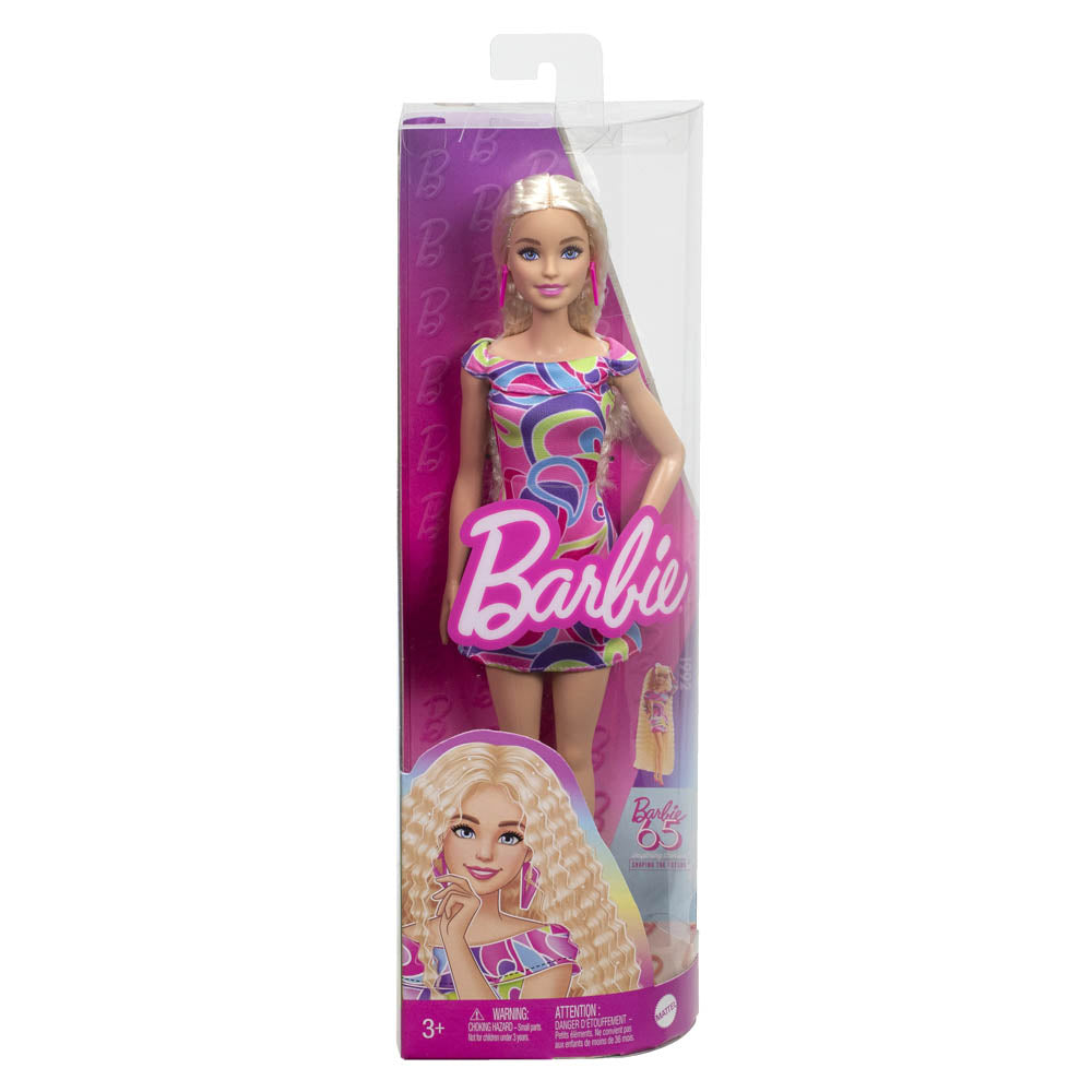 Η κούκλα Barbie γιορτάζει 65 χρόνια από το χαρακτηριστικό στυλ με μοντέρνες ανατροπές σε εμβληματικές εμφανίσεις και πολλές μοναδικές πινελιές! Εμπνευσμένη από το Totally Hair look της από το 1992, η κούκλα Barbie Fashionistas φορά ένα πολύχρωμο φόρεμα με εντυπωσιακό print! Οι ροζ γόβες Barbie και τα φωτεινά ροζ σκουλαρίκια ανεβάζουν το look σε αυτό το ντύσιμο! Η κούκλα Barbie έχει κυματιστά μακριά ξανθά μαλλιά για να γιορτάσει τη ρετρό αυτή εμφάνιση! Με ατελείωτες δυνατότητες styling και αφήγησης, οι κούκλες Barbie κάνουν ένα υπέροχο δώρο για θαυμαστές, συλλέκτες και παιδιά 3 ετών και άνω!