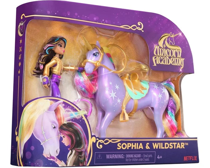 Εμπνευσμένο από τη σειρά κινουμένων σχεδίων του NETFLIX και τη σειρά βιβλίων με τις μεγαλύτερες πωλήσεις, όπου η φιλία κυριαρχεί, αυτό το σετ θα πυροδοτήσει ατελείωτες φανταστικές ιστορίες. Η Σοφία 4,5 ιντσών διαθέτει ρεαλιστικές λεπτομέρειες και 7 σημεία άρθρωσης. Ο Wildstar έχει ύψος 5 ίντσες και συμπληρώνει την εμφάνιση της Σοφίας με σημάδια Light Magic και χαίτη και ουρά ουράνιου τόξου με βούρτσα (η βούρτσα περιλαμβάνεται). Με τα αφαιρούμενα αξεσουάρ χαλινάρι και σέλα, η Σοφία μπορεί να παραμείνει με ασφάλεια στη θέση της πάνω στον Wildstar. Ζήστε μαγευτικές περιπέτειες στην Ακαδημία Μονόκερων με το σετ Sophia & Wildstar.